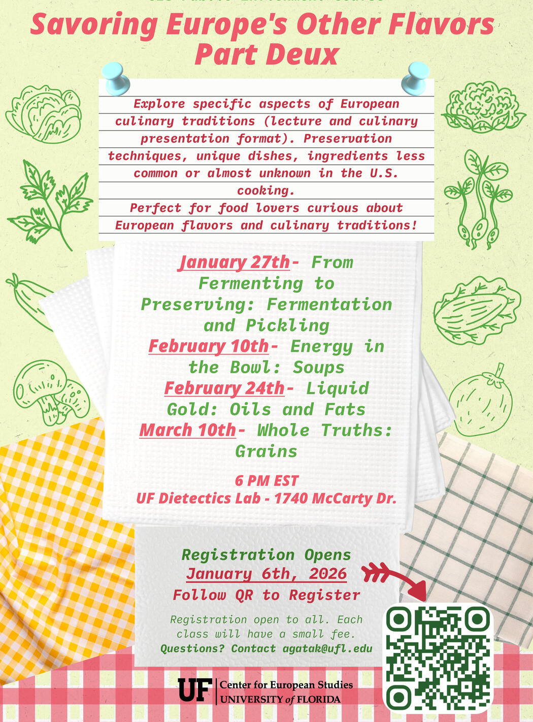 Explore specific aspects of European culinary traditions (lecture and culinary presentation format). Preservation techniques, unique dishes, ingredients less common or almost unknown in the U.S. cooking.